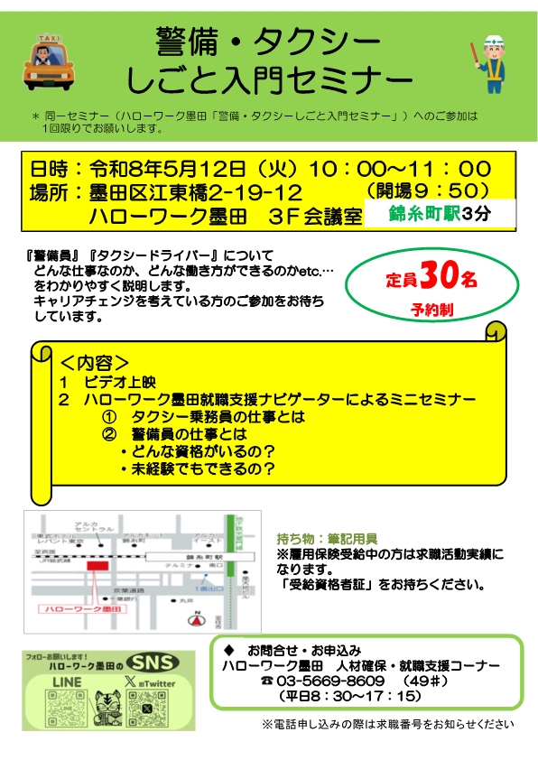 ハローワーク墨田にて、警備員・タクシードライバーについての入門セミナーを行います。
