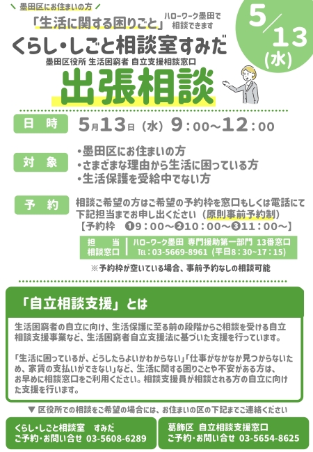 【5月13日】くらし・しごと相談室すみだ:出張相談(ハローワーク墨田)