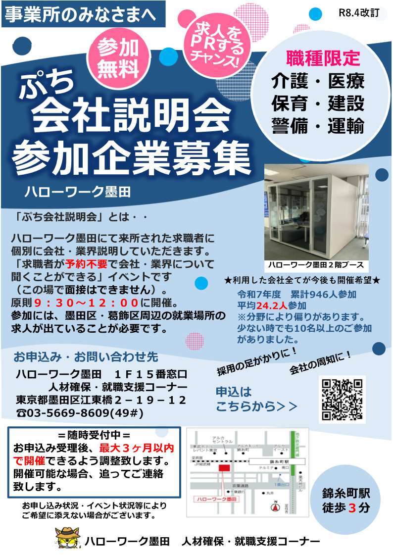 ハローワーク墨田 人材確保・就職支援コーナー TEL:03-5669-8609 (49#)