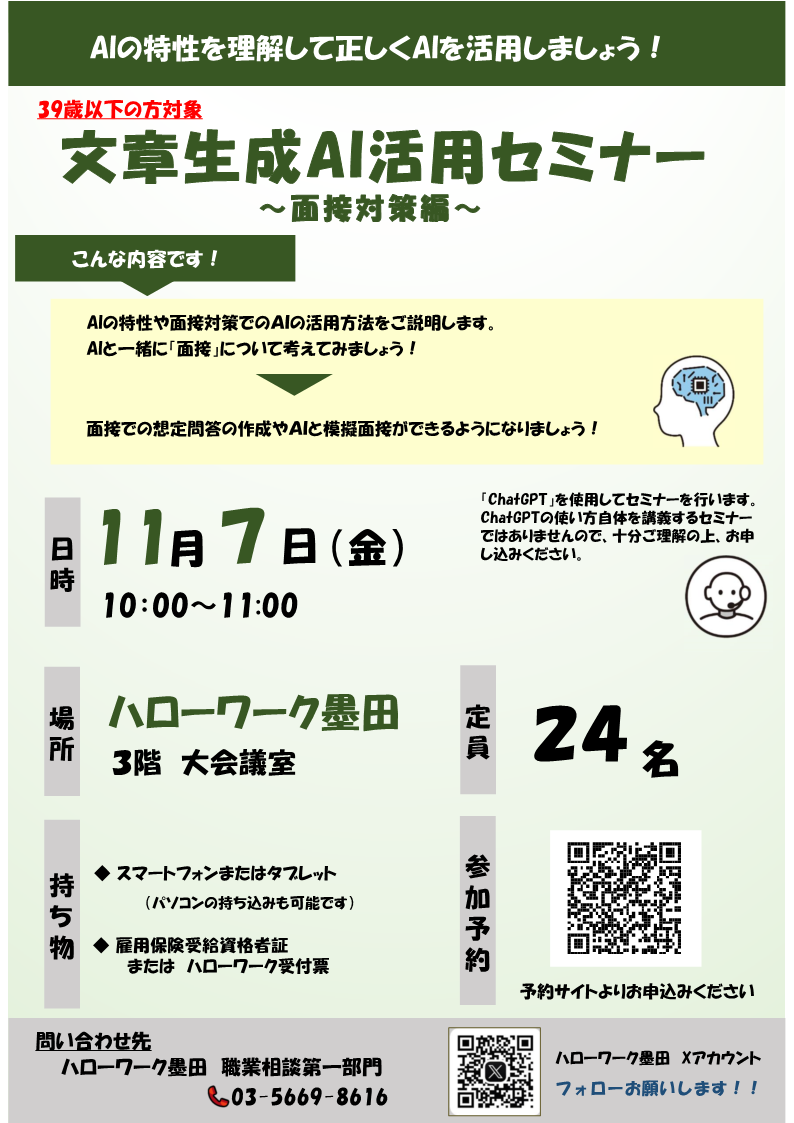 【11月7日開催】文章生成AI活用セミナー ~面接対策編~(39歳以下対象)
