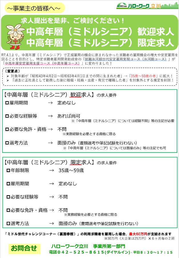 ⇒ ハローワーク立川ミドル世代チャレンジコーナー