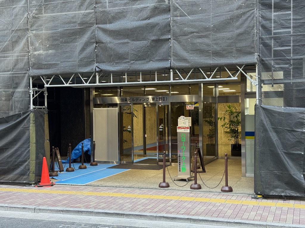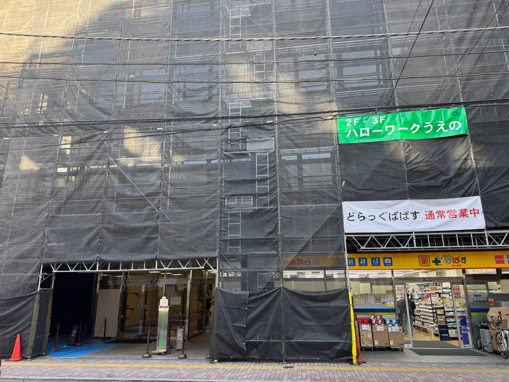 ・工事期間中は足場架設の関係で「ハローワーク上野」の看板が見づらくなっていますが、通常どおり業務を行っております。