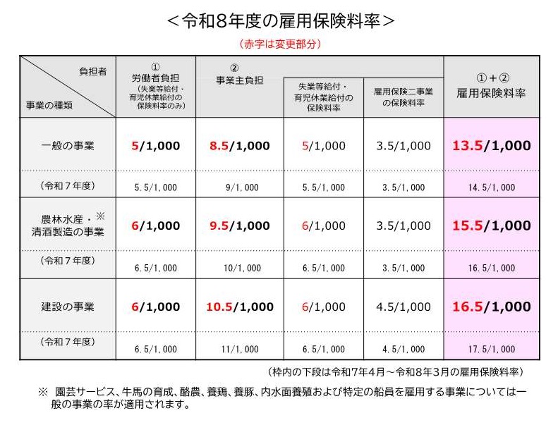 令和8(2026)年4月1日から令和8(2027)年3月31日までの雇用保険料率は以下のとおりです。