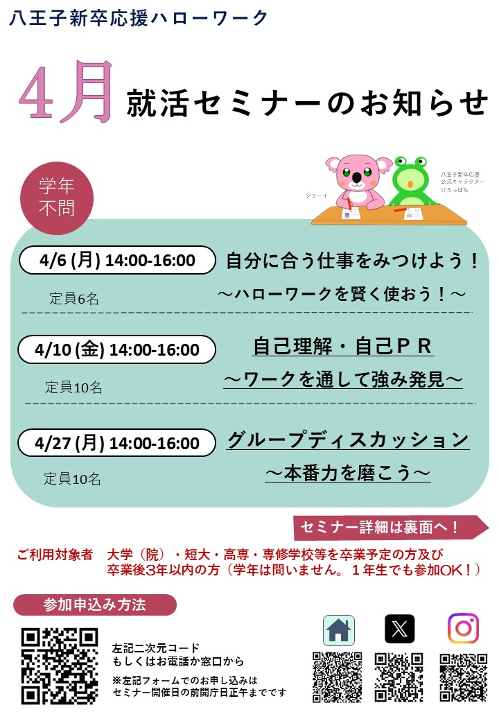 八王子新卒応援ハローワークでは、みなさんの就職活動をサポートするセミナーを定期的に開催しています!