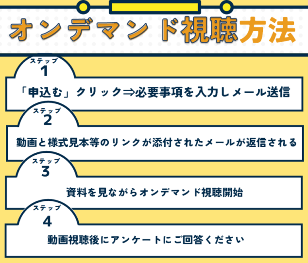 申込みメール送信後、1日経っても返信メールが届かない場合はお電話ください。 - 視聴後は必ずアンケートにご回答ください。