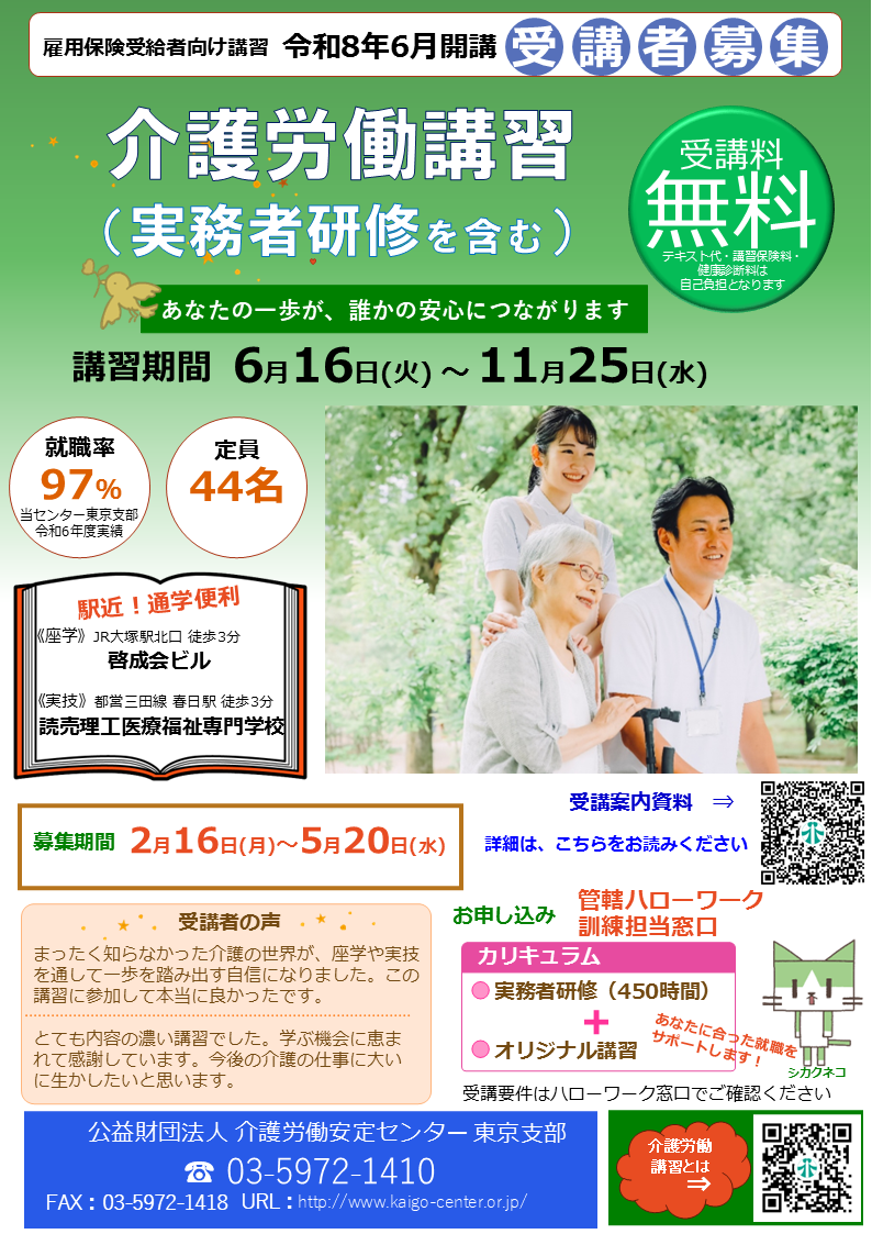 | ▶令和8年6月開講 介護労働講習のご案内 介護労働安定センター東京支部HP(令和8年2月25日更新) |
