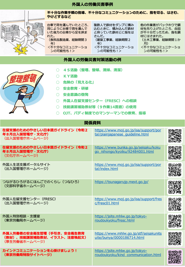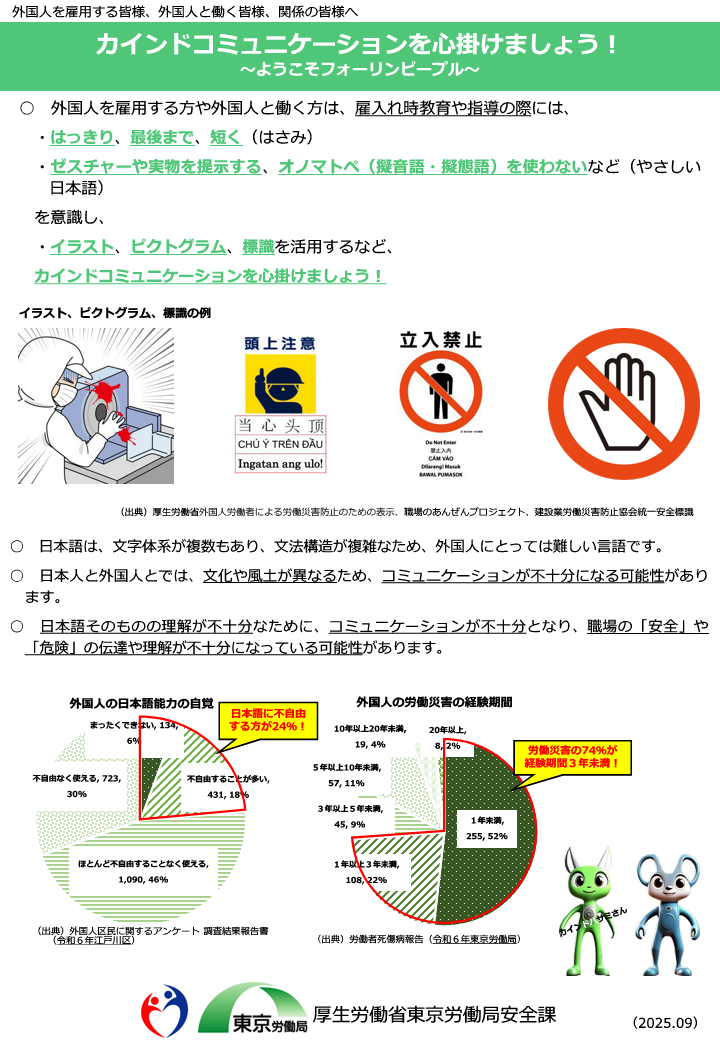 東京労働局では、外国人の労働災害が増えていることもあり、教育や指導の際には、優しく親しく、はっきり、最後まで、短く(はさみ) 伝えるなど、カインドコミュニケーションを心掛ける意識(意思)を促進しています。