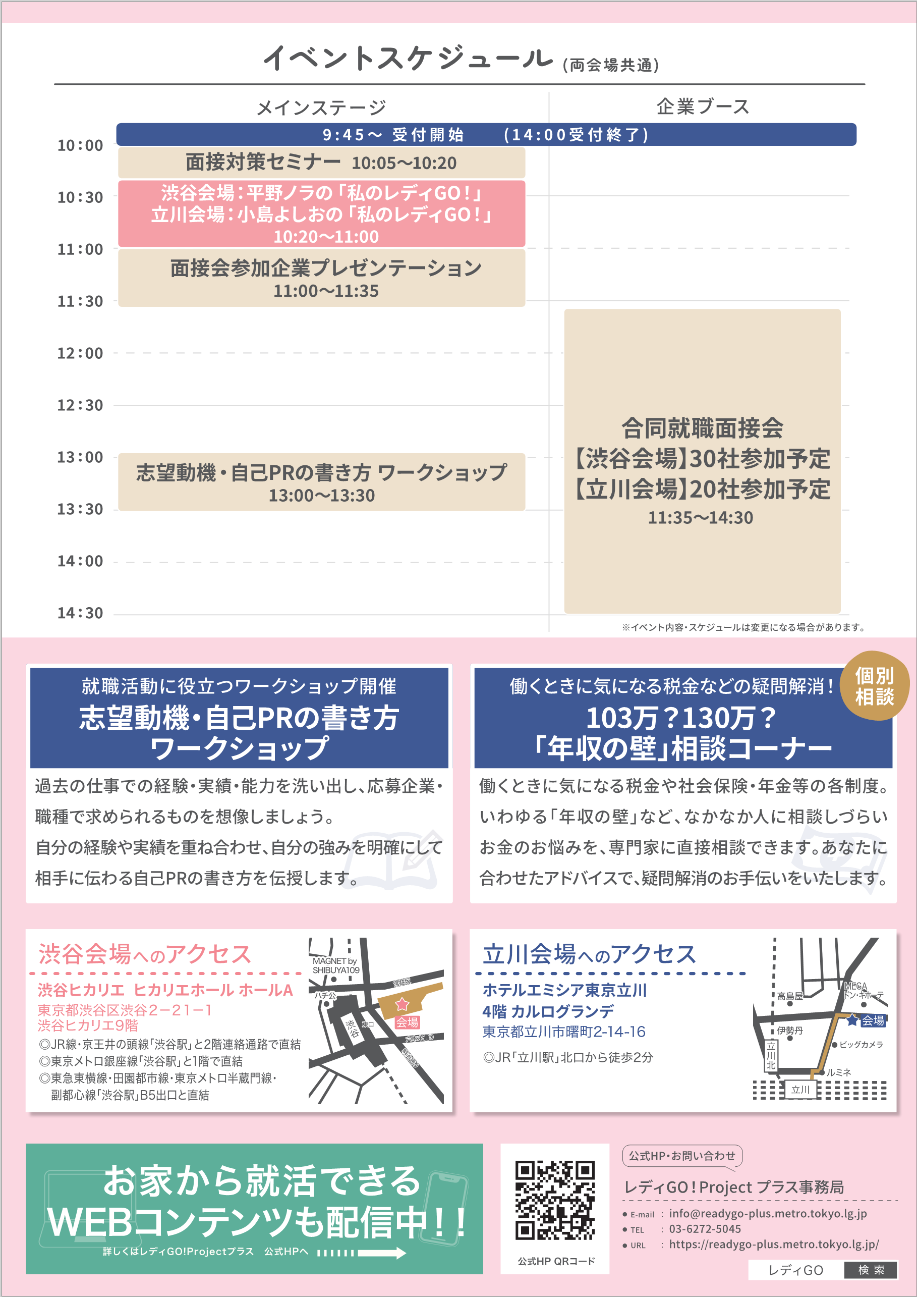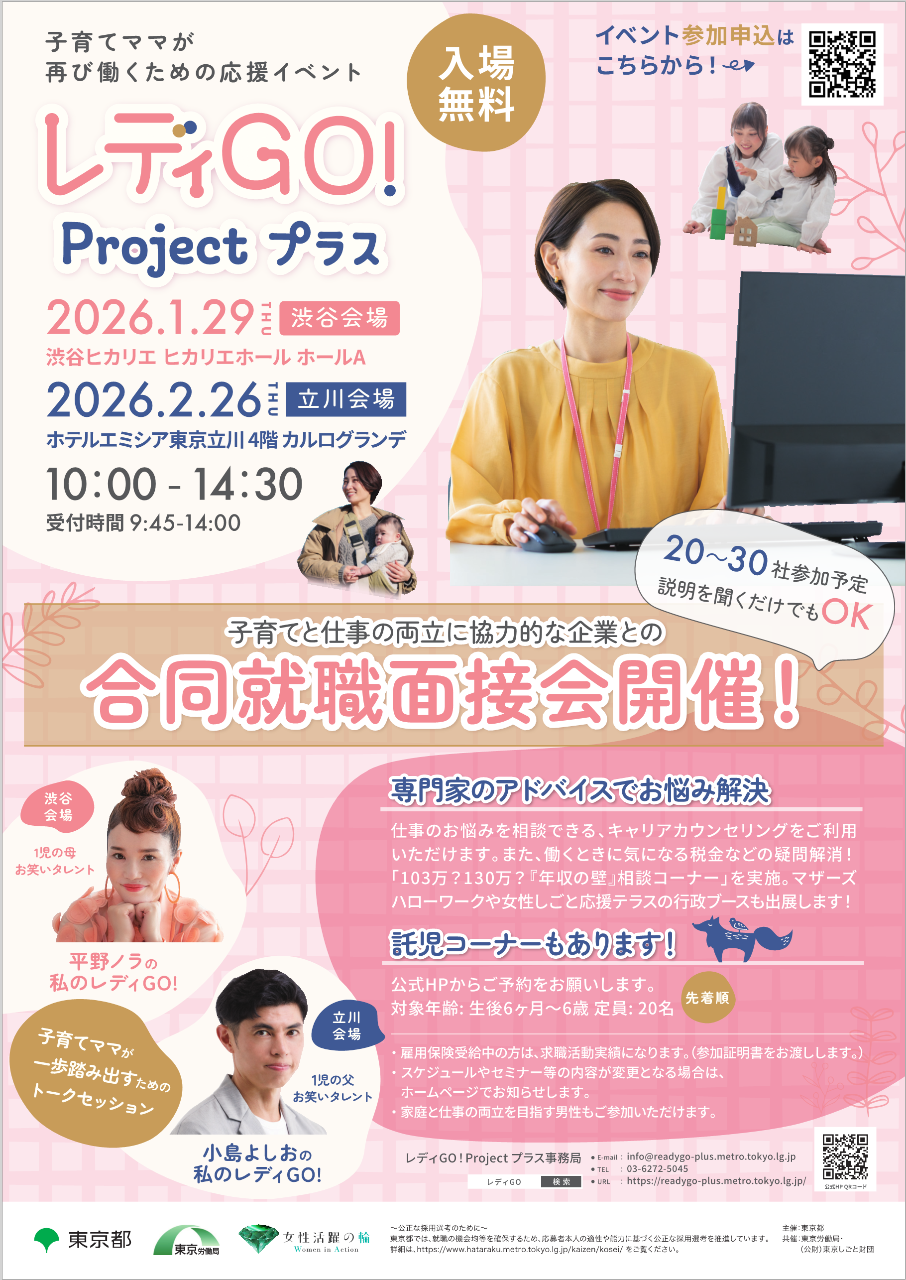 - 【申込み開始!】「レディGO!Projectプラス」における仕事と子育て両立支援合同就職面接会の開催について(第4回渋谷会場・第5回立川会場)