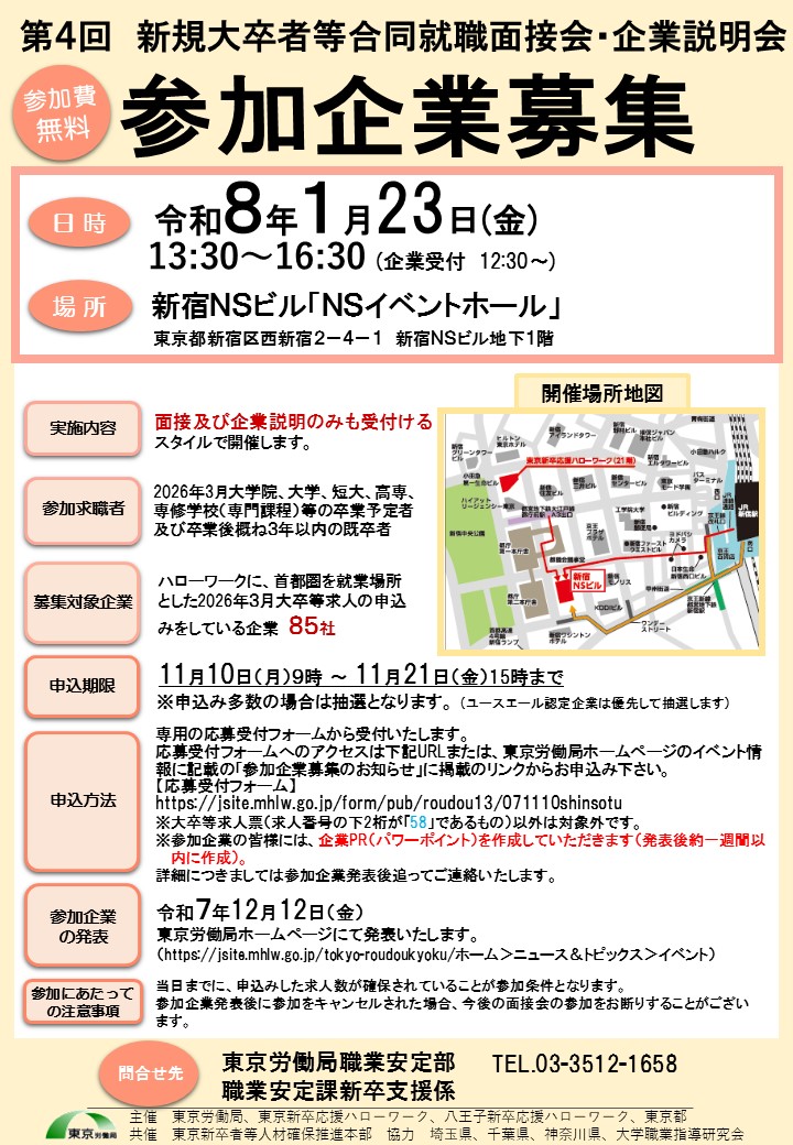 - 「第4回 新規大卒者等合同就職面接会・企業説明会」参加企業募集のお知らせ(2026.1.23)