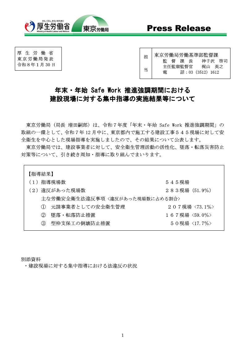 - 年末・年始 Safe Work 推進強調期間における建設現場に対する集中指導の実施結果等について