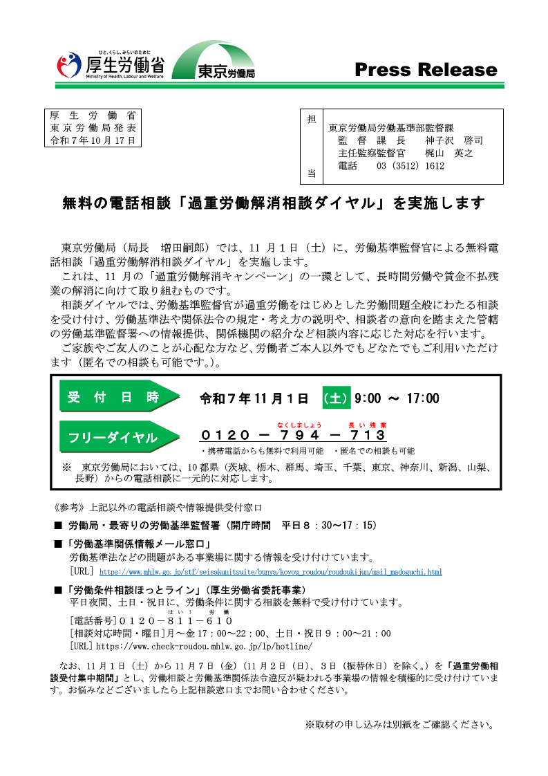 11月1日(土)に無料の電話相談「過重労働解消相談ダイヤル」を実施します。ご家族やご友人のことが心配な方など、労働者ご本人以外でもどなたでもご利用いただけます。匿名での相談も可能です。