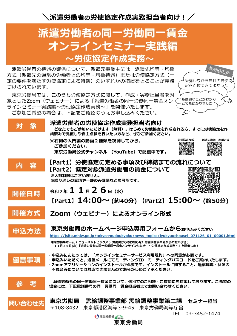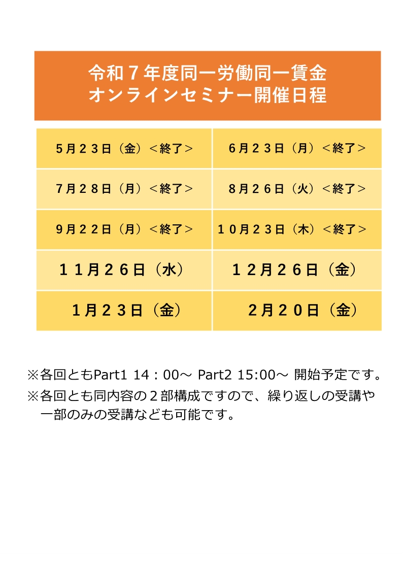 - 11月26日(水)「派遣労働者の同一労働同一賃金オンラインセミナー ~労使協定作成実務~」を開催します
