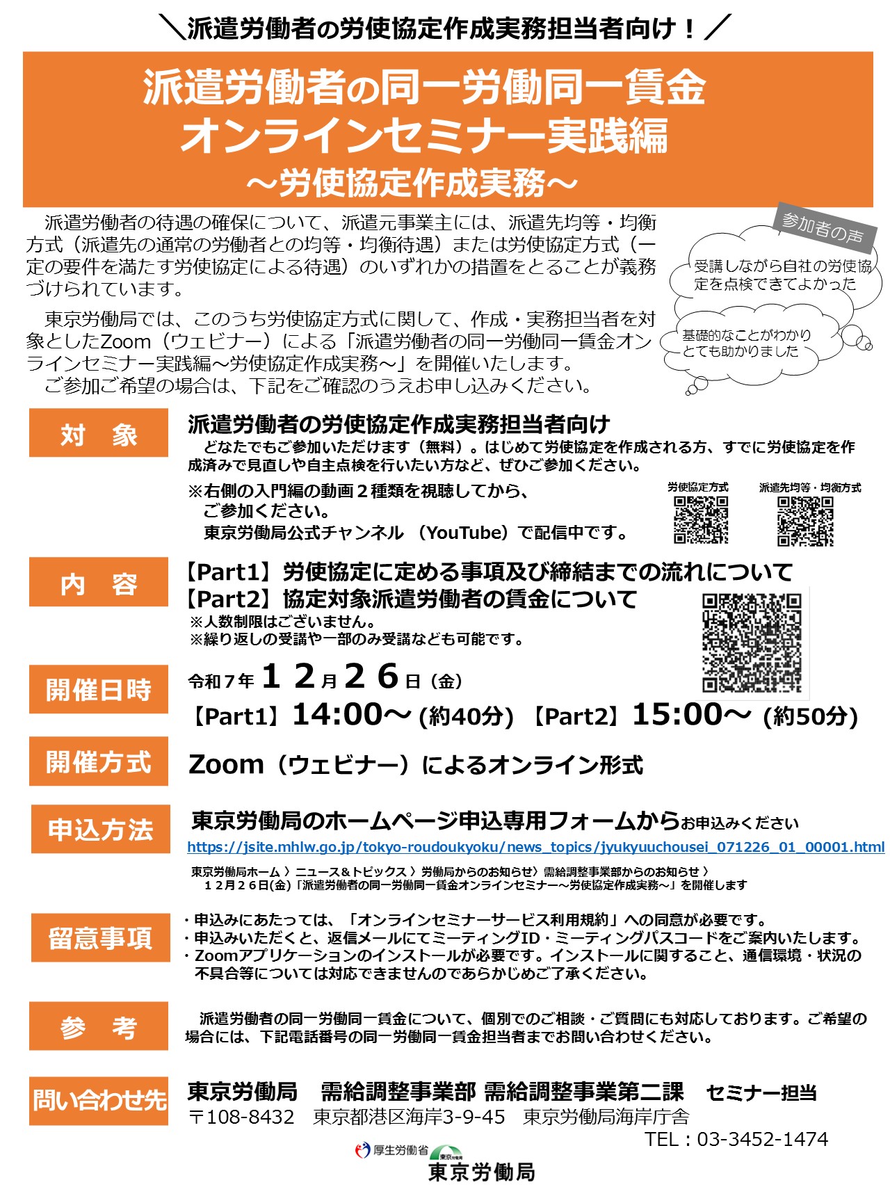 - 12月26日(金)「派遣労働者の同一労働同一賃金オンラインセミナー ~労使協定作成実務~」を開催します