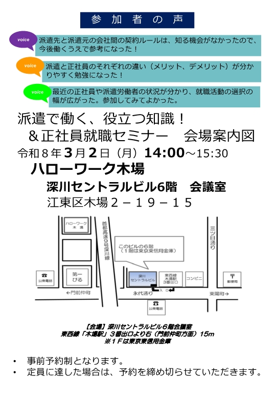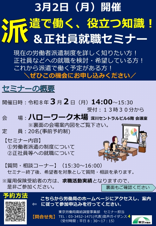 - 派遣労働者セミナーを3月2日(月)にハローワーク木場で開催します!