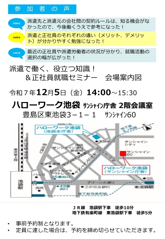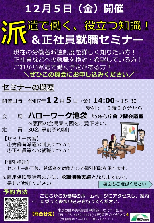 - 派遣労働者セミナーを12月5日(金)にハローワーク池袋で開催します!