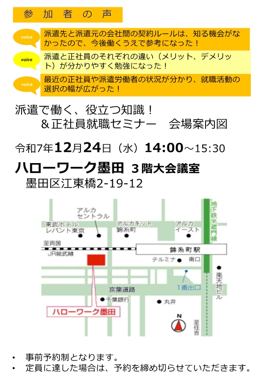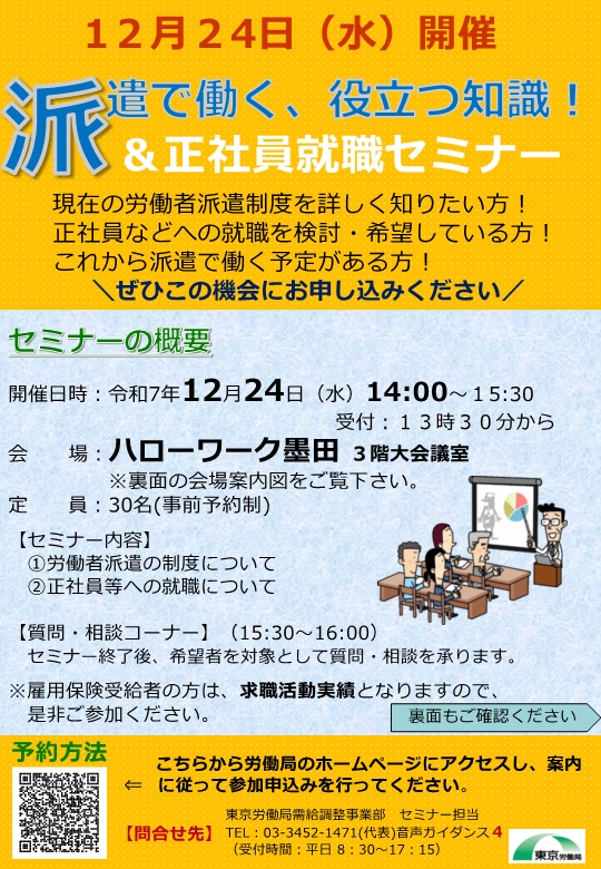 - 派遣労働者セミナーを12月24日(水)にハローワーク墨田で開催します!