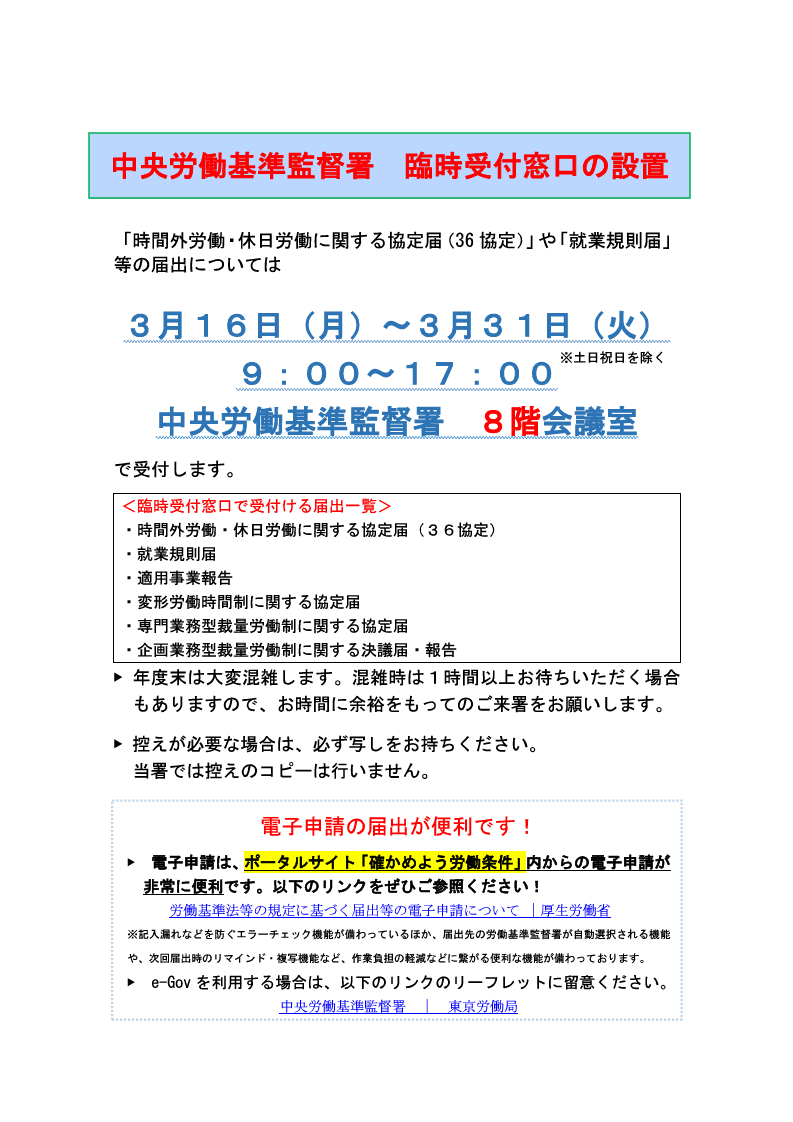 新型コロナウイルス感染症の拡大防止のため、36協定・就業規則を届出していただく場合、郵送や「e-Gov」による電子申請での届出をお願いします。