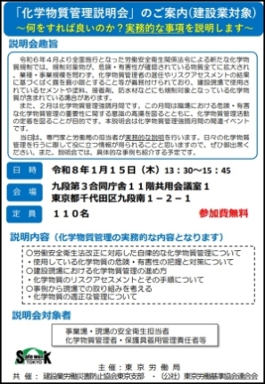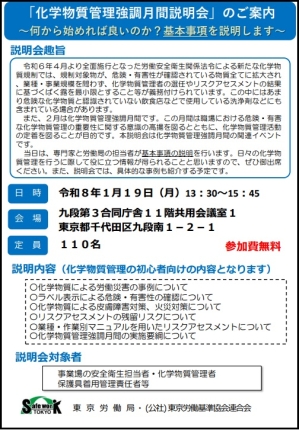 化学物質管理強調月間を迎えるにあたり、専門家と労働局の担当者が化学物質管理のポイント等について説明を行います。