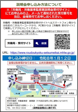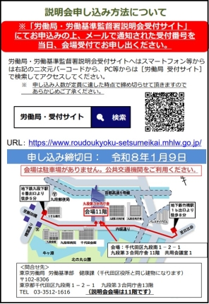 参加申し込みは「労働局・労働基準監督署説明会受付サイト」(☜クリック)からお願いします。