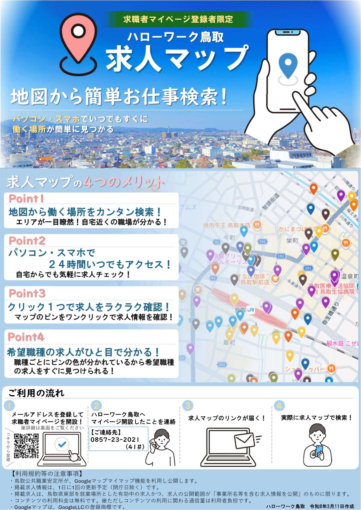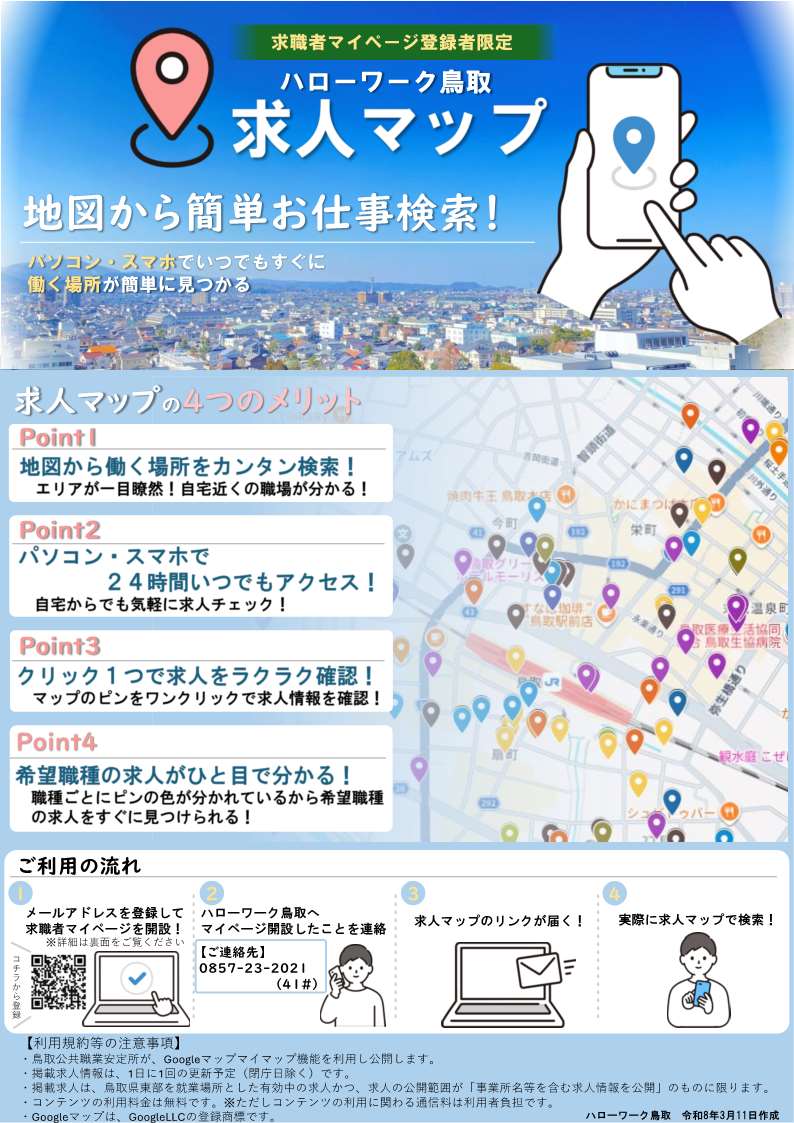 鳥取公共職業安定所は、求職者の利便性向上を目的とし、Googleマイマップを利用した新しい求人情報提供サービスを開始することとしましたので、お知らせします。