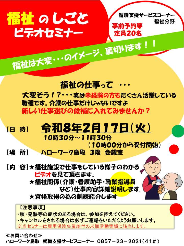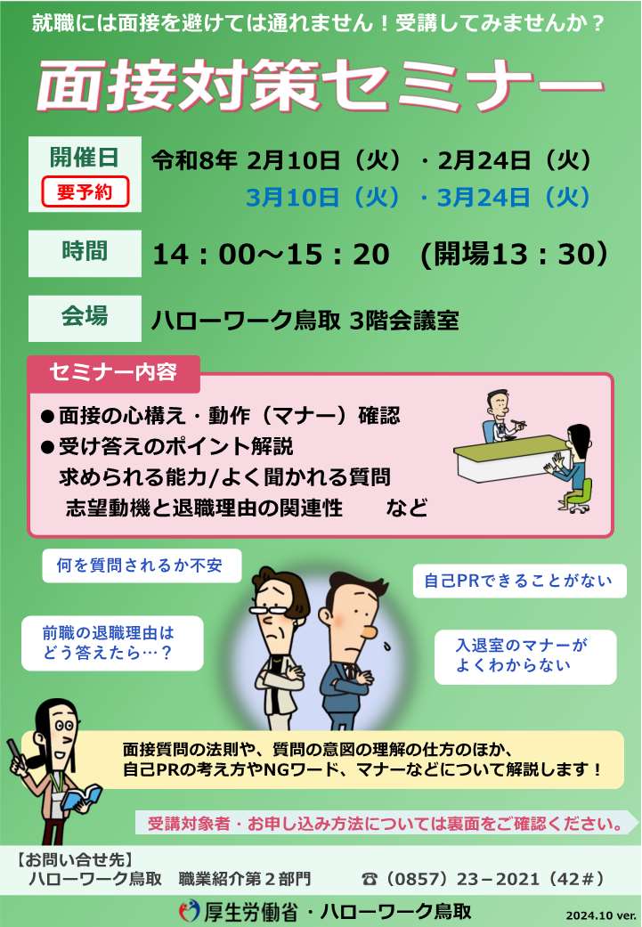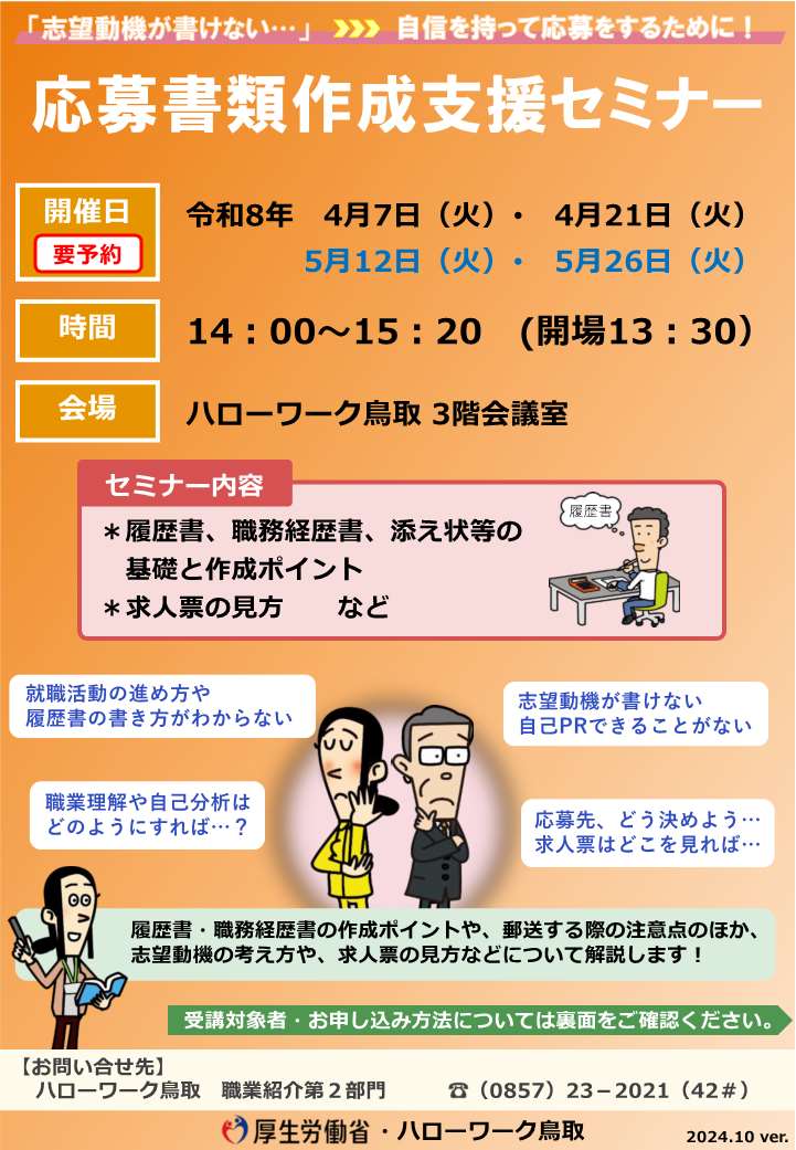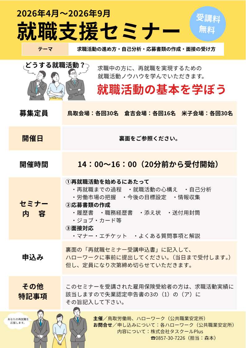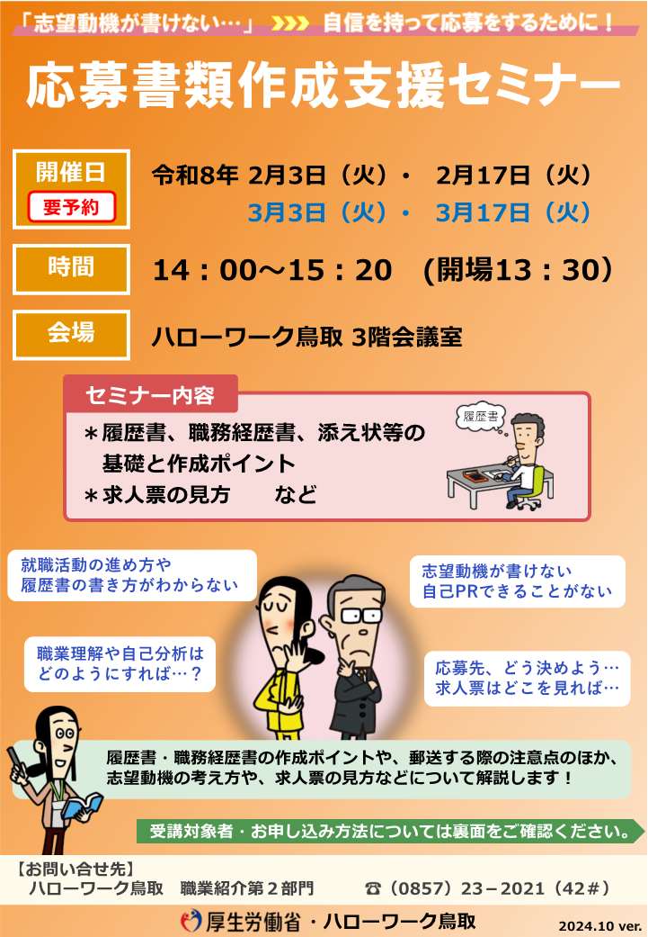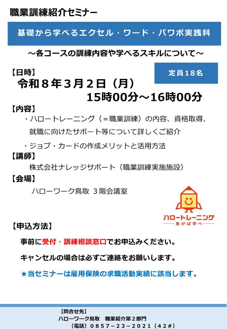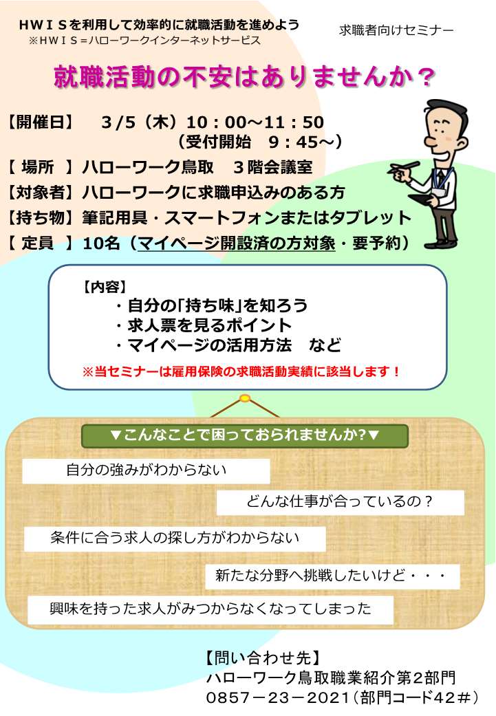 ハローワーク鳥取では、各コーナーでそれぞれ求職者向けセミナーを開催しています。