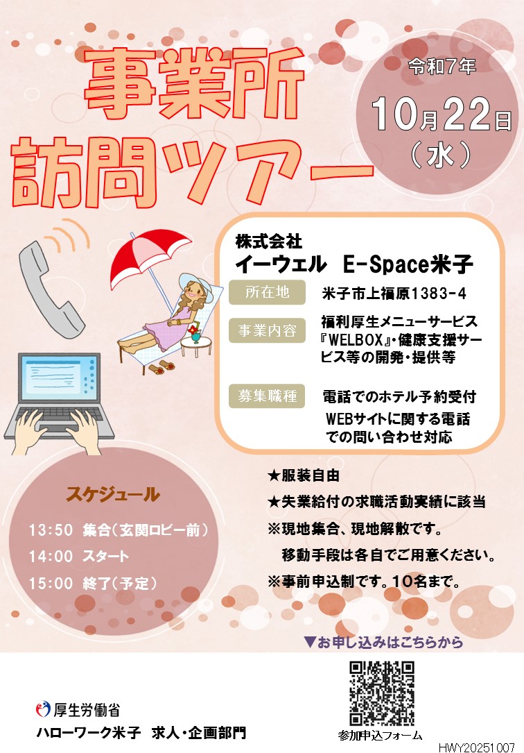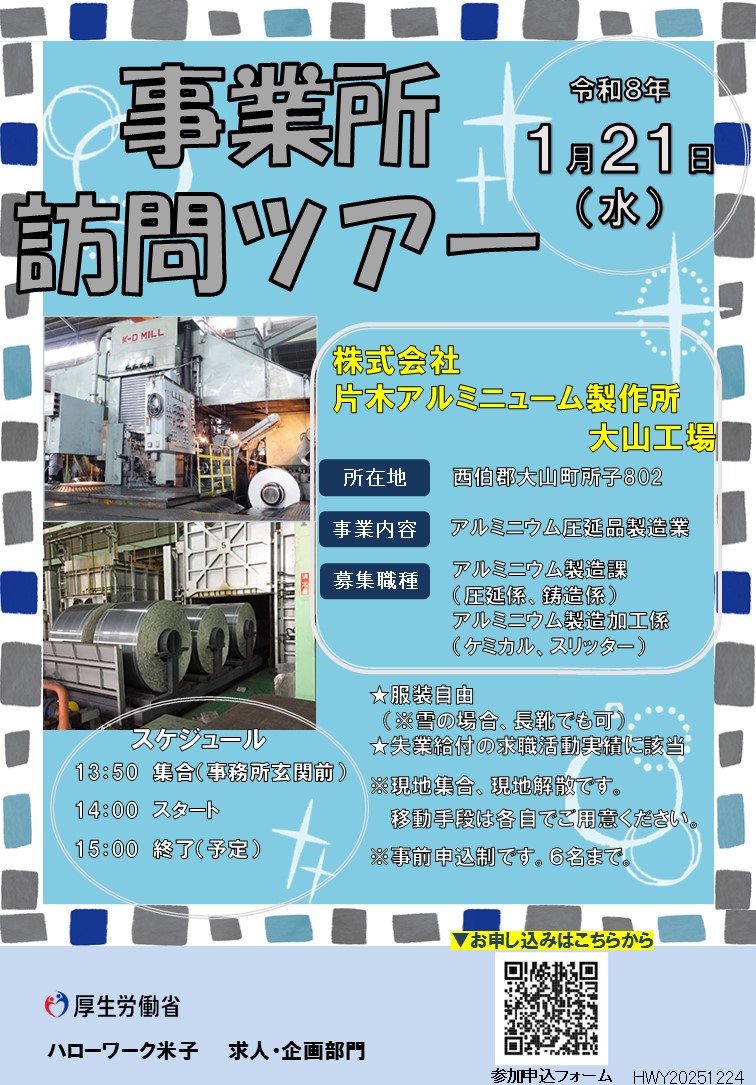 ハローワーク職員と一緒に事業所を見学し、求人票では分からない職場の雰囲気や仕事の様子を実際に見て、感じることができます。ぜひお気軽にご参加ください。