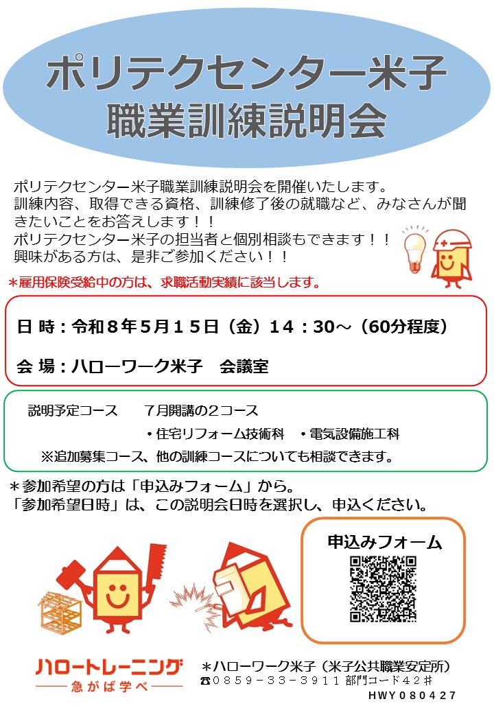 ハローワーク米子 訓練担当 0859-33-3911(部門コード#42)
