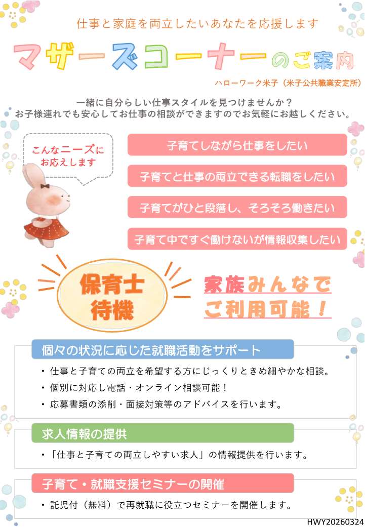 仕事と子育ての両立を希望する方をサポートする相談窓口がハローワークマザーズコーナーです。