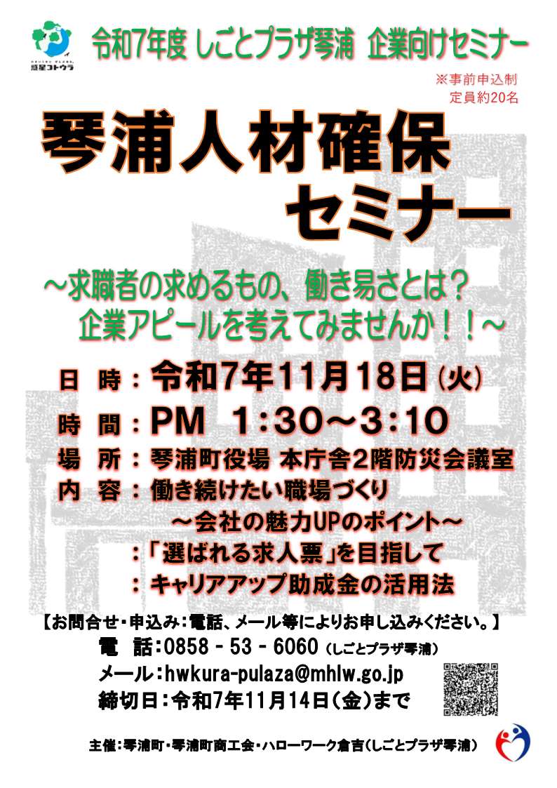 つきましては、11月14日までに「しごとプラザ琴浦」へ、電話等によりお申し込みください。