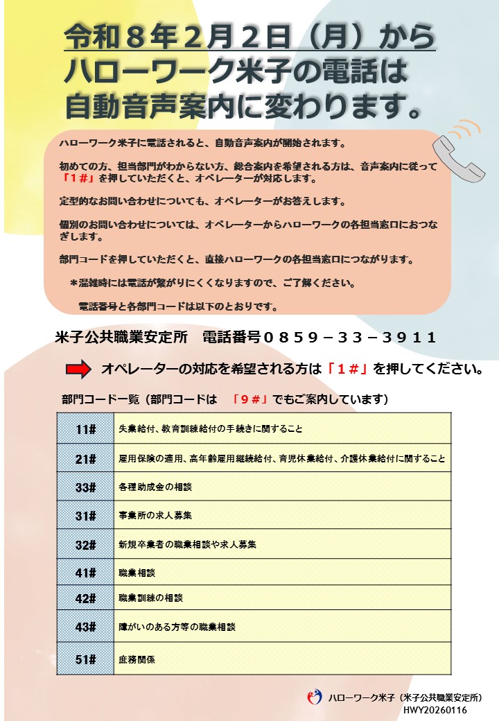 令和8年2月2日(月)からハローワーク米子の電話は自動音声案内に変わります。