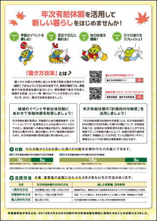 11月4日(火)と11月21日(金)は、年次有給休暇取得推奨デーです。鳥取市、倉吉市、琴浦町、南部町の公立学校及び県立学校の一部では、「体験的学習活動等休業日」に指定されています。祝日 (11月3日文化の日・24日勤労感謝の日)と土日を絡めて連休のチャンス!年次有給休暇を活用して家族の時間を作りましょう。