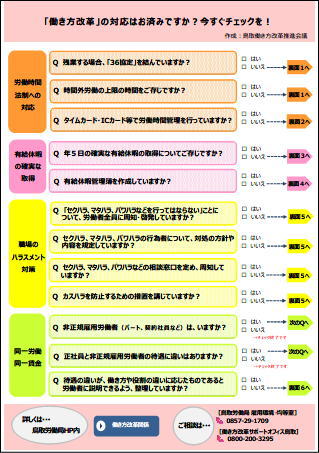 鳥取働き方改革推進会議では、11月を鳥取働き方改革推進キャンペーン月間とし、県内企業の働き方改革の推進に向け、様々なイベントを計画するとともに、相談体制を整え、支援行っていきます。企業の皆様に於かれましては、この機会に、自社の取組状況を再確認いただき、働き方改革に向けた取り組みについて一層進めていただきますようお願いします。