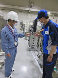 同工場では労働災害防止対策について説明を受け、また、工場内を巡視し、加工機械、ベルトコンベアー周囲のカバーや駆動部に手が入らない措置の対応状況、VRを活用した安全衛生教育や安全装置の有効性点検など、主にはさまれ・巻き込まれ災害を防止するための機械への本質安全化やリスクアセスメントの実施等、先進的な取組を確認しました。