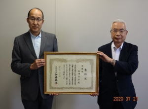 表彰状を掲げる松浦喜房氏(左)と能勢隆之所長(右)(鳥取産業保健総合支援センター提供)