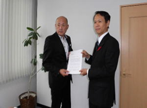 陸上貨物運送事業労働災害防止協会((一社)鳥取県トラック協会)宮本事務局長(左)に緊急要請を手交する高橋労働基準部長