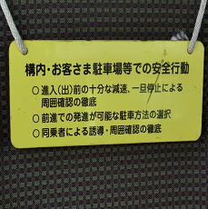 中国電力(株)鳥取営業所 社有車の運転席シートに掛け た掲示板により、運転者は 「構内・お客さま駐車場等で の安全行動」を確認し、 発進する |