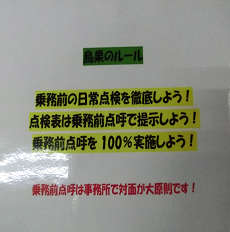 有限会社 鳥果運輸 事務所において、乗務前の 点呼を対面で行うことを ルール化して運転手の 健康状態を確認している |