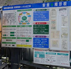 (株)大林組 鳥取自動車道智頭用瀬トンネル 北工事屋外の掲示板に スローガン、無災害記録表 及び今月の安全重点目標等を 掲示して意識付けを行ってい る事例 |