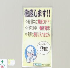 西松建設(株) 鳥取西道路気高青谷トンネル 工事第2工事 「徹底します!! 修理中は 電源OFF 修理中看板掲示 電源は勝手に入れません」 の作業ルールを、イラスト 付きで掲示している事例 |