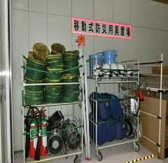FDK株式会社 火災等を想定して必要な用具を 一か所に集積し、大きく明示する ことで、初期消火活動を迅速に 行うことができる |