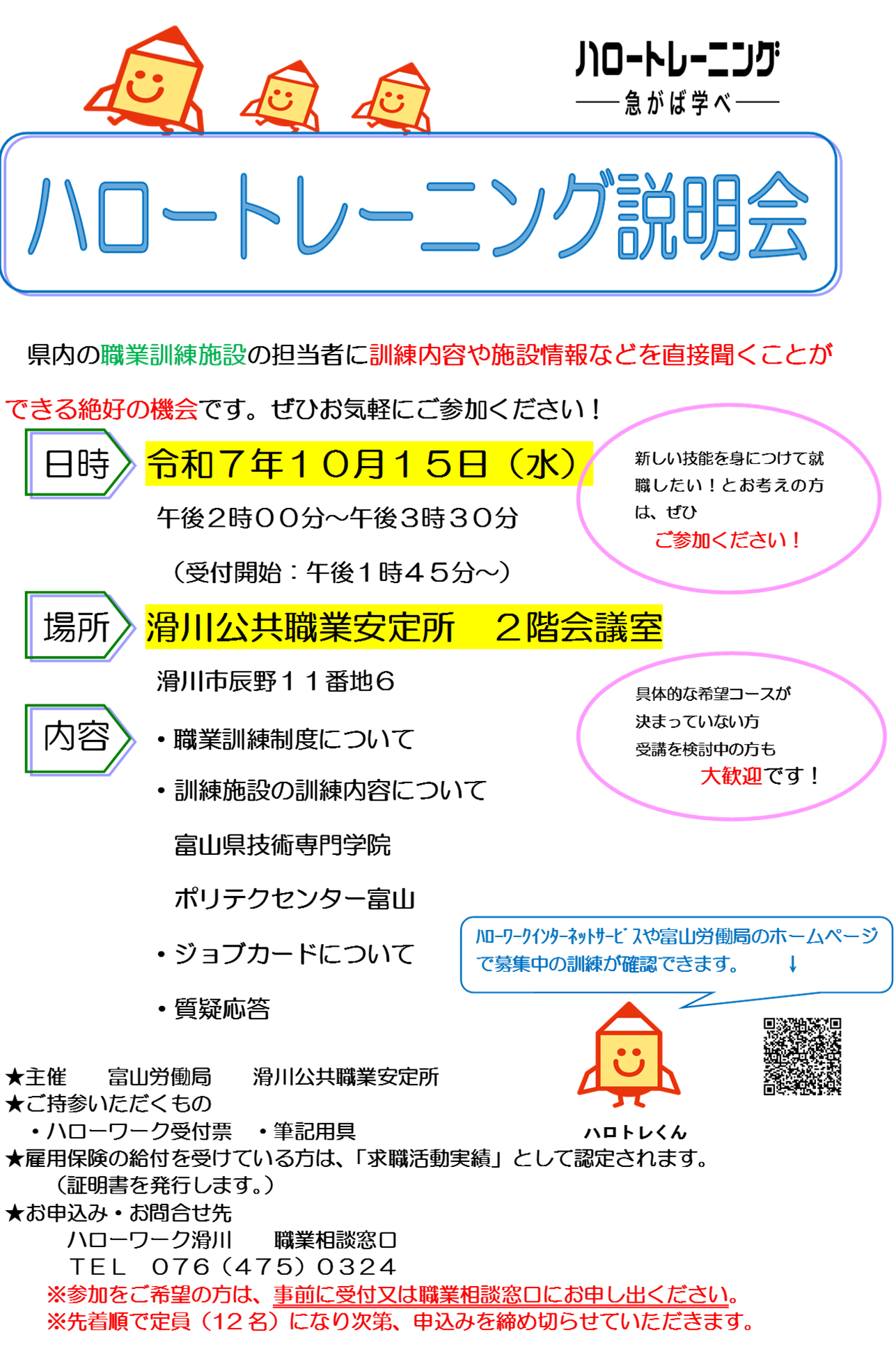 ![]() ![]() ハローワーク滑川 ハロートレーニング説明会を開催します! 令和7年10月15日(水)14時00分~ |