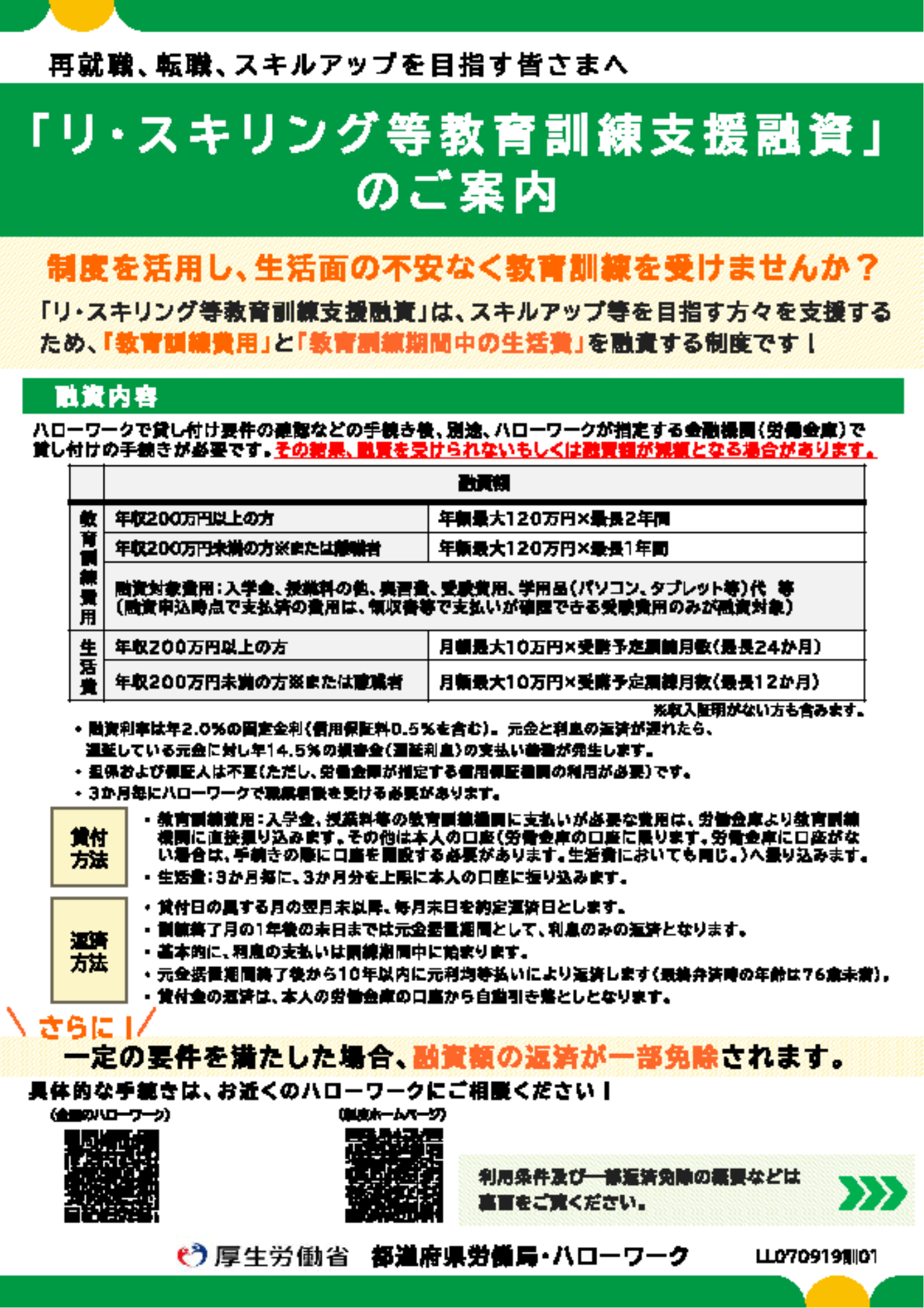 ◇リーフレット「リ・スキリング等教育訓練支援融資」のご案内 | |