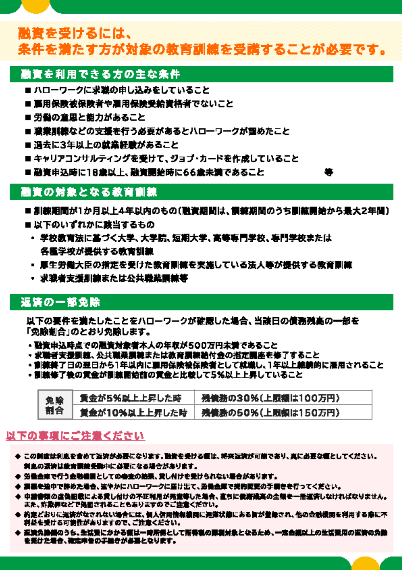 生活面の不安なく訓練を受けることができるよう「教育訓練費用」と「教育訓練期間中の生活費」を融資します。さらに、訓練を終了した方が、一定の要件を満たした場合、債務残高の返済が一部免除されます。