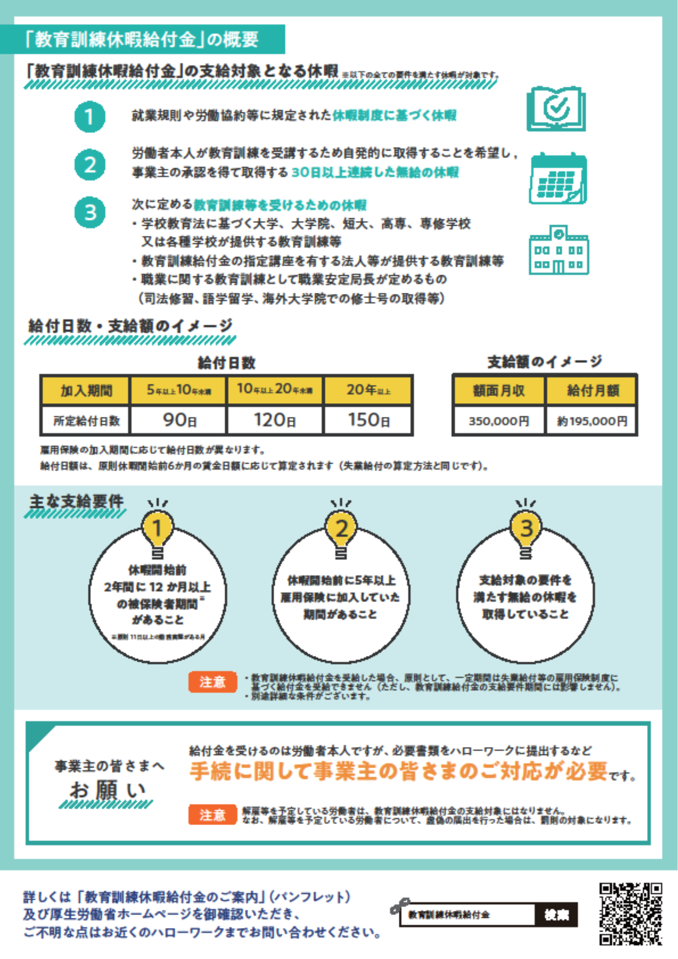 スキルアップ等を目指す方々を支援する融資制度です。生活面の不安なく訓練を受けることができるよう「教育訓練費用」と「教育訓練期間中の生活費」を融資します。さらに、訓練を終了した方が、一定の要件を満たした場合、債務残高の返済が一部免除されます。 制度の詳細については、厚生労働省ホームページ をご覧ください。 ![]() |