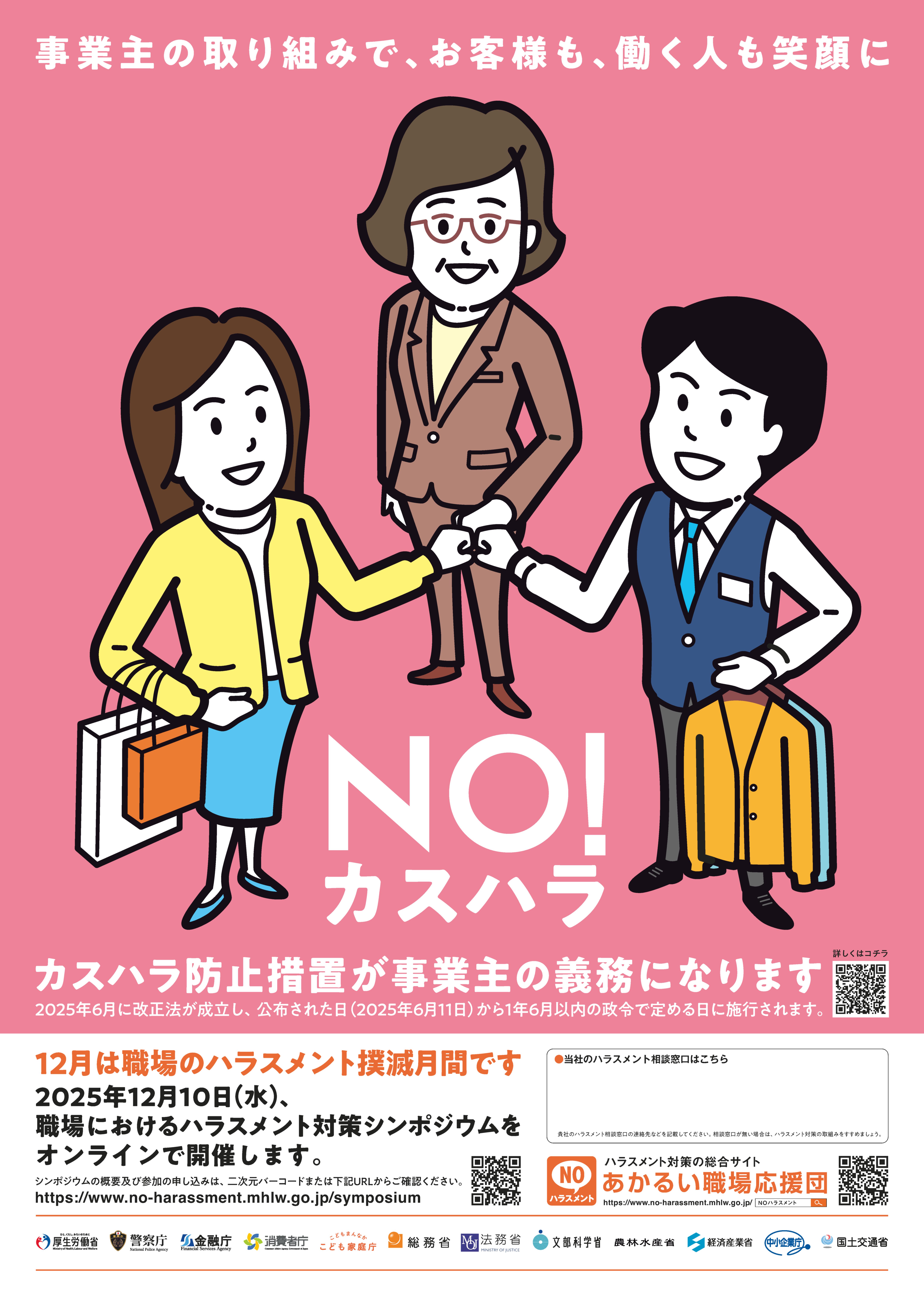 令和7年6月に「カスタマーハラスメント対策」と「求職者等に対するセクハラ対策」の義務化に係る内容が公布され、公布後1年6か月以内の政令で定める日に施行される見込みです。