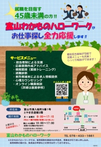 富山わかものハローワークはわかもの(45歳未満の方)を中心に、就職・転職活動をサポートするハローワークです。(学生を除く)土曜開庁日は年齢不問です。