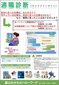 ハローワークで受検(予約制)![]() 調べた結果を窓口で相談することもできますよ! 入力:1時間、説明:約30分 |