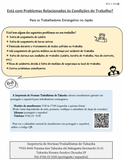 Durante o mês de abril, não será possível realizar consultas em português na Inspetoria de Normas Trabalhistas de Takaoka devido à ausência do tradutor. Pedimos desculpas pelo transtorno, porém será possível realizar consultas no serviço de atendimento telefônico citado abaixo.