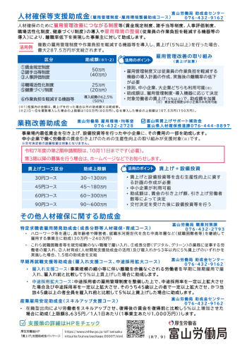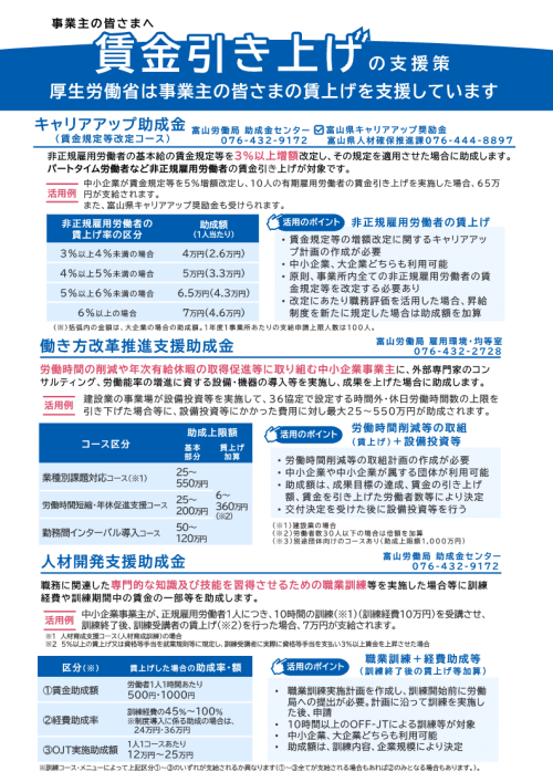 厚生労働省 富山労働局では、生産性向上(設備・人への投資等)や、非正規雇用労働者の処遇改善、その他人材確保に関する助成金により、賃金引上げに向けた取組みを支援しています。