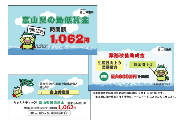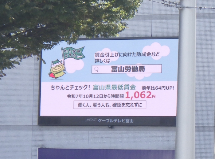 富山県最低賃金は、10月12日(日)から時間額1,062円です。 働く方も、雇う方も、忘れずに確認をお願いします。 富山駅前CICビル及び電気ビルの大型ビジョンでは、厚生労働省広報キャラクターの「たしかめたん」が改正富山県最低賃金額や賃金引上げ支援策をPRします。 このPR動画は、10月1日から31日まで毎時4回放映されます。 【動画の内容】画像をクリックするとダウンロードできます。